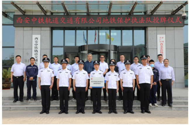 5月17日上午,西安中铁轨道交通有限公司香王车辆段综合楼前举行地铁保护执法队授牌仪式,公司党委书记、董事长杨俊峰、公司副总经理王伟杰、相关职能生产部门管理人员、员工代表及执法队员共计20余人参加本次活动。