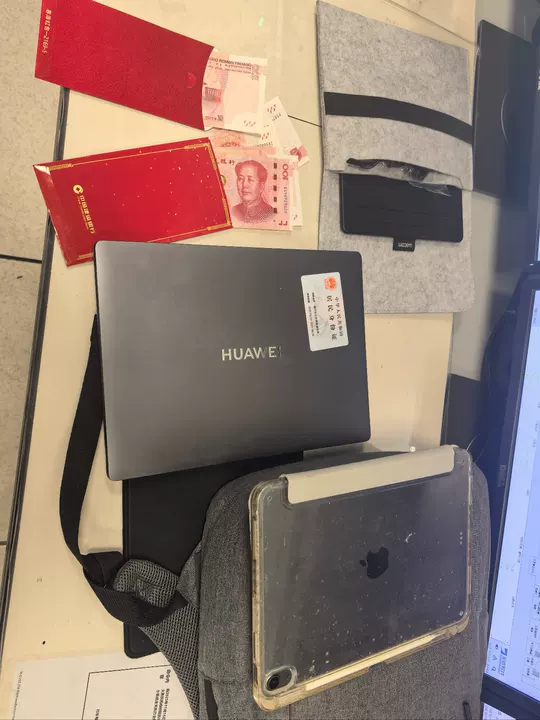 灰色双肩包1个(现金1200元,笔记本电脑1个,平板1个,身份证1张,银行卡1张,电子画板1个)